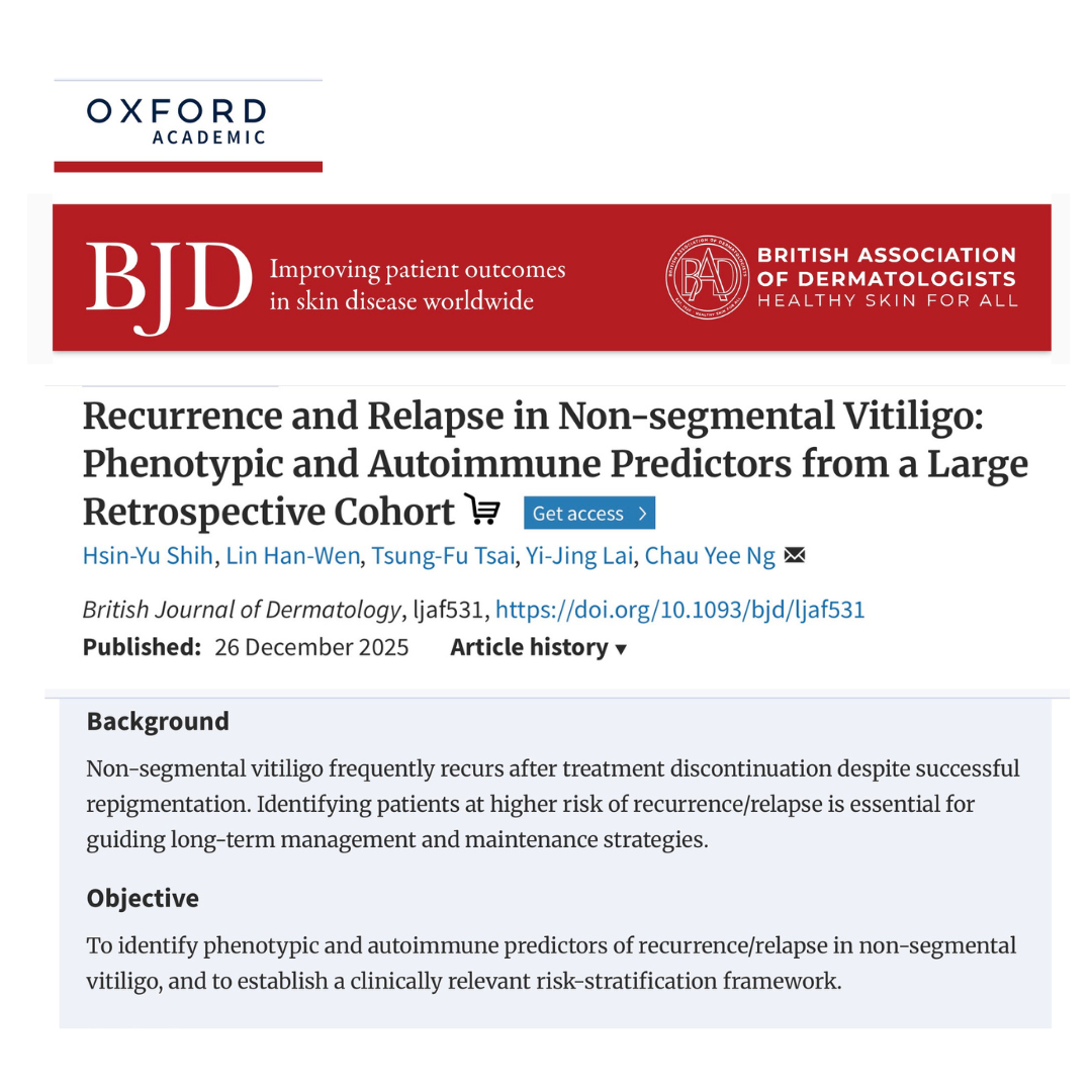 白斑治療中心(以下簡稱本中心) 在白斑治療研究領域再創佳績。本中心主任 黃昭瑜醫師帶領研究團隊,針對非節段型白斑(Non-segmental Vitiligo)治療後的復發因子進行大規模回溯性研究,成果不僅具高度臨床價值,更獲得皮膚科領域全球排名前三之權威期刊《英國皮膚病學雜誌 (British Journal of Dermatology, BJD)》接受發表。